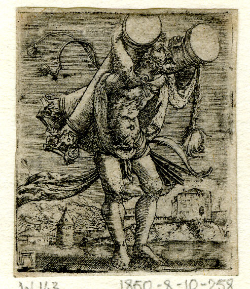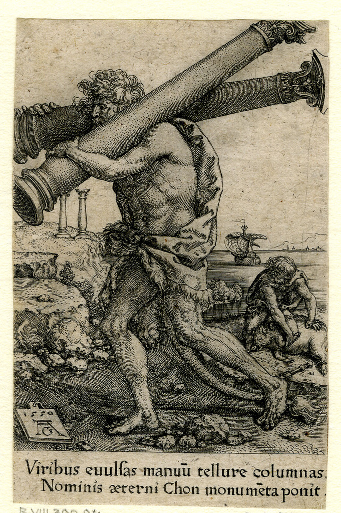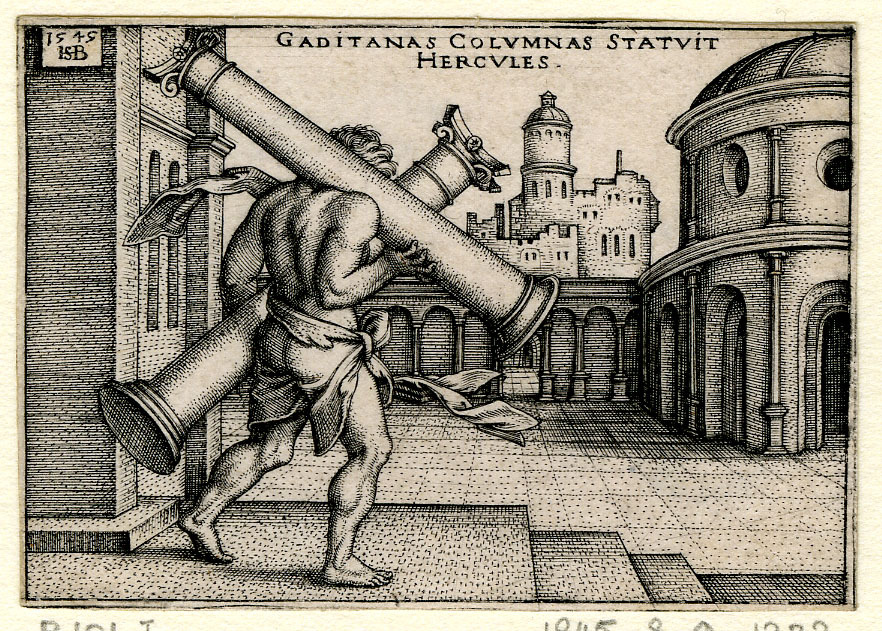 Hércules cargando las columnas de Gades Hércules cargando las columnas de Gades; caminando hacia la derecha en primer plano a la izquierda hacia unos escalones de piedra; un paisaje urbano con un templo redondo a la derecha en el fondo; de una serie de doce grabados.
