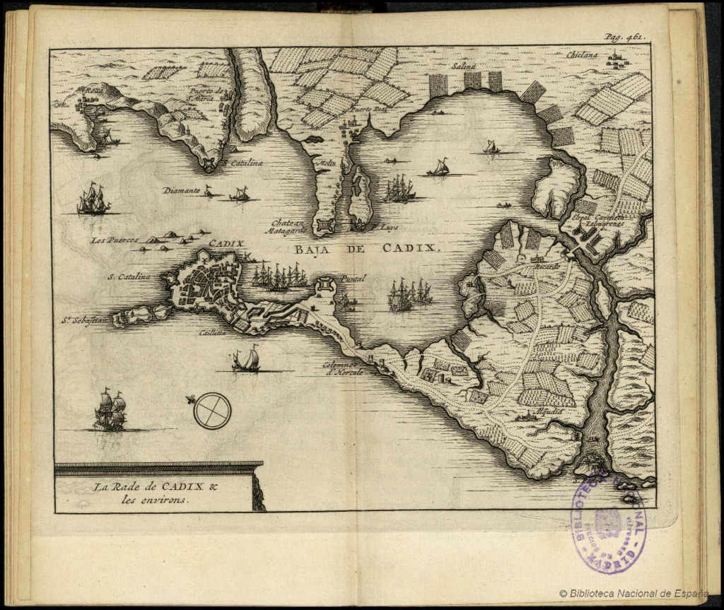 Plano de Cádiz. En la obra: "Les delices de l'Espagne & du Portugal " de Juan Álvarez de Colmenar. Volumen 3 página 461. Plano dela Bahía de Cádiz encontrado en la obra "Les delices de l'Espagne & du Portugal " de Juan Álvarez de Colmenar. Volumen 3 página 461.