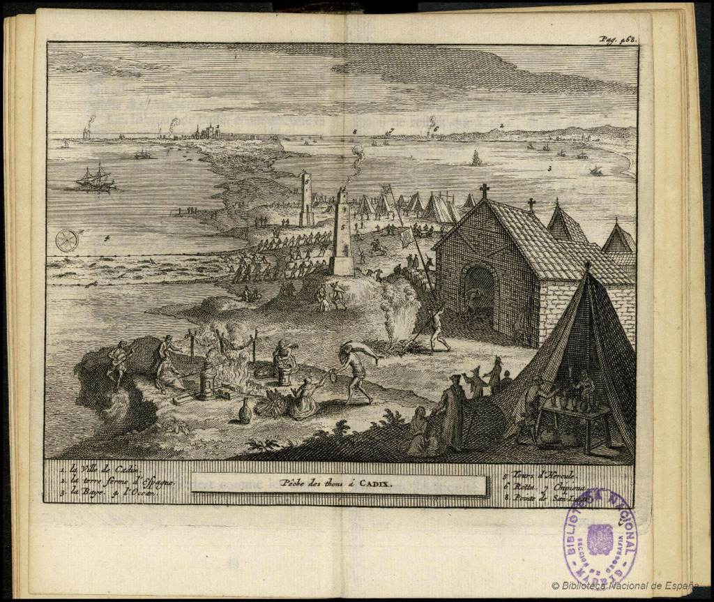 Pesca del Atún. En la obra: "Les delices de l'Espagne & du Portugal " de Juan Álvarez de Colmenar. Volumen 3 página 468. Práctica de la pesca del atún, vemos una representación de como sería esta actividad. En primer plano vemos un almacén y personas cocinando el atún. Al fondo la ciudad de Cádiz y a media altura, personas trabajando en la orilla.