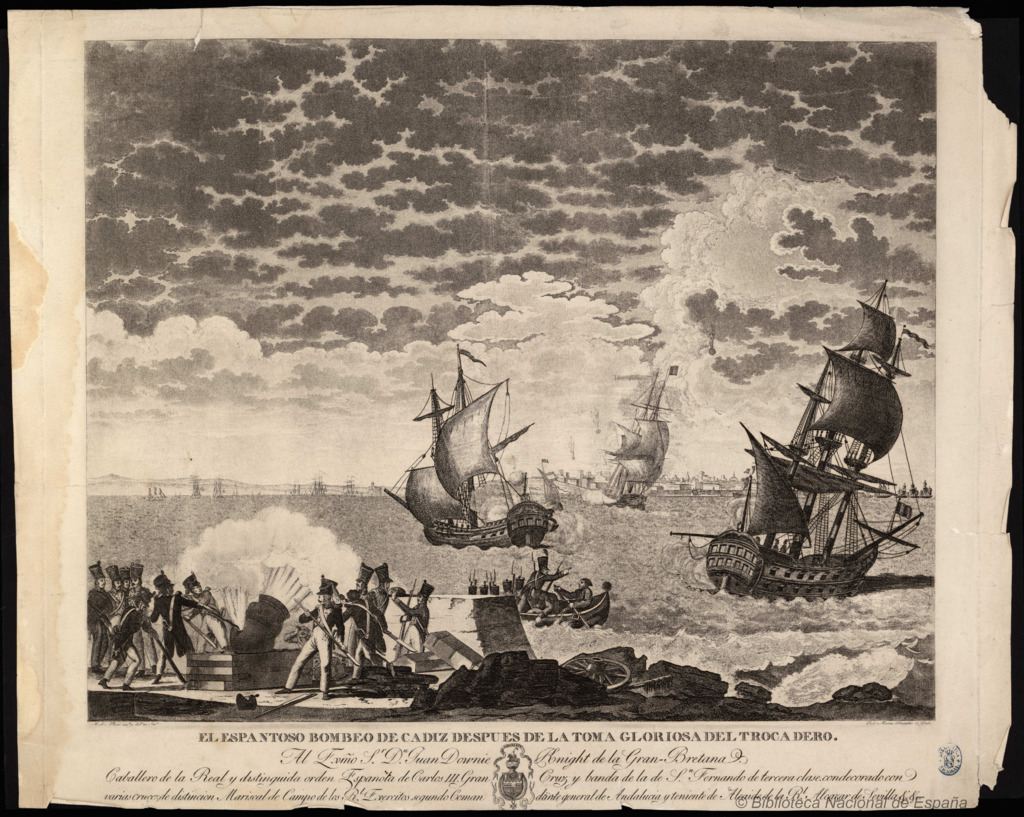 El Espantoso bombeo de Cádiz después de la toma gloriosa del Trocadero Grabado que ilustra el bombardeo de Cádiz en 1823, tras la toma del Trocadero por las fuerzas francesas. La obra refleja la devastación de la ciudad durante la restauración del absolutismo de Fernando VII.
