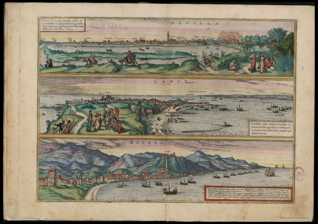 Tres grabados en una sola pagina que representan a las ciudades de Sevilla, Cádiz y Málaga respectivamente.