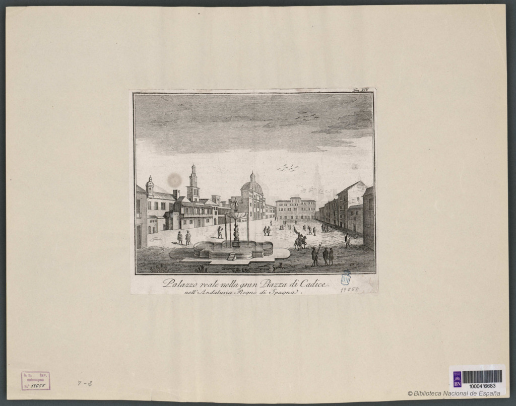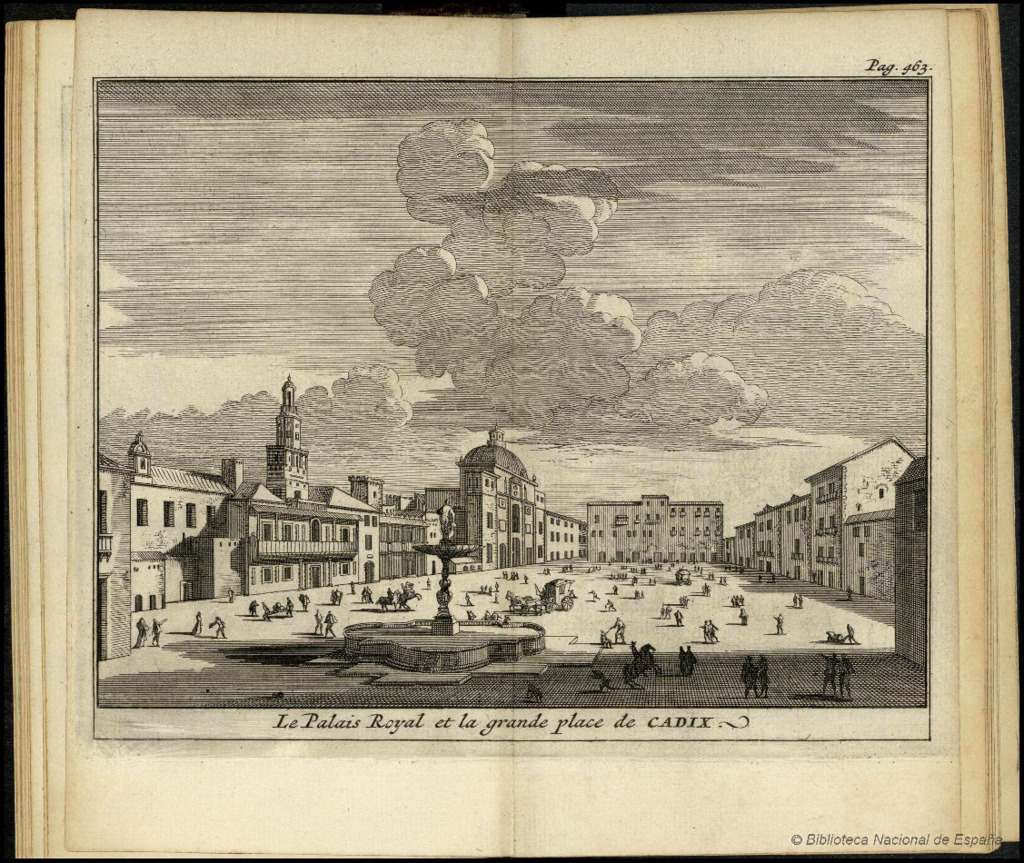 Gran Plaza de Cádiz. En la obra: "Les delices de l'Espagne & du Portugal " de Juan Álvarez de Colmenar. Volumen 3 página 463. Representación de la plaza de Cádiz, con una fuente en primera vista, personas y carruajes, rodeado por edificios arquitectónicos y un fondo de nubes ascendente.