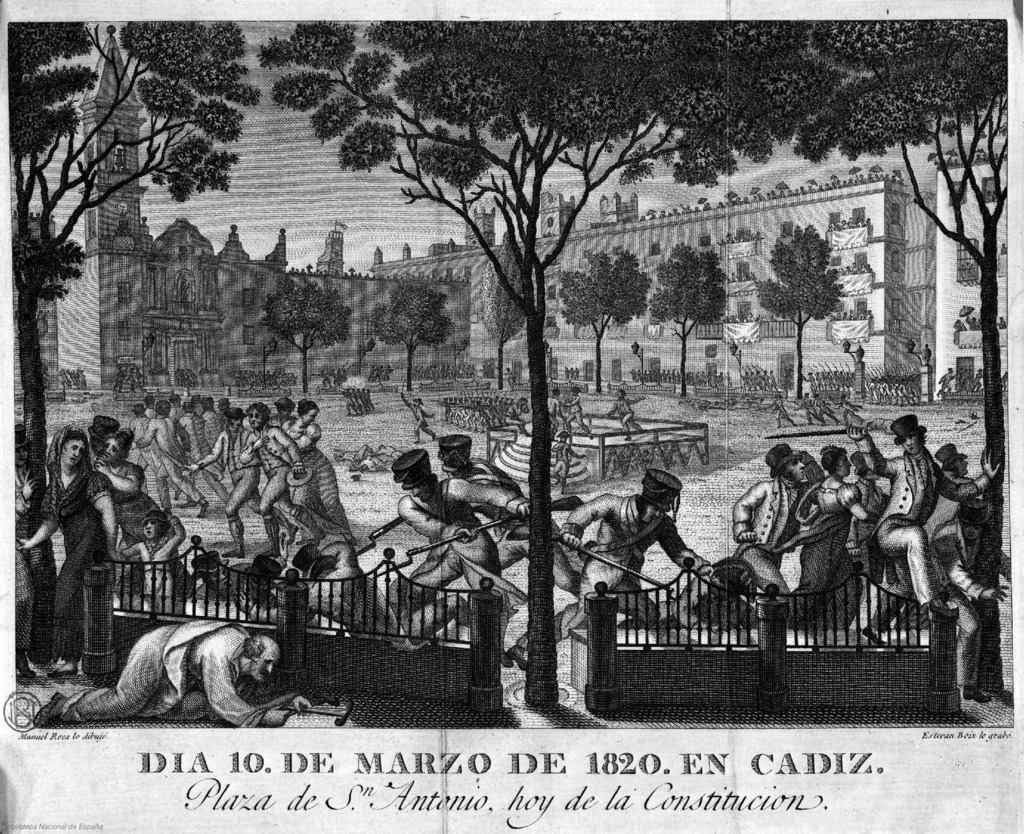 Día 10 de Marzo de 1820 en Cádiz. Plaza de San Antonio (actualmente Plaza de la Constitución) Este trágico suceso, conocido como la "Matanza de Cádiz", marcó un punto de inflexión en el pronunciamiento liberal iniciado por Riego semanas antes.