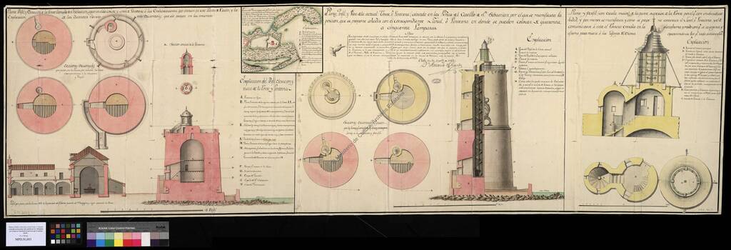 Plano, Perfil, y elevación de la torre llamada de S[a]n Sebastian, segun en el dia existe, y sirve de Linterna a las embarcaciones a las embarcaciones, que entran en este Puerto de Cádiz ... Porción del Plano en grande de Cadiz, por la que se manifiesta parte del castillo de S[a]n Sebastian, peñas de su frente, Hermita del mismo nombre unida la casa del Governador, Puesto en donde esta situada la Torre del Farol ...