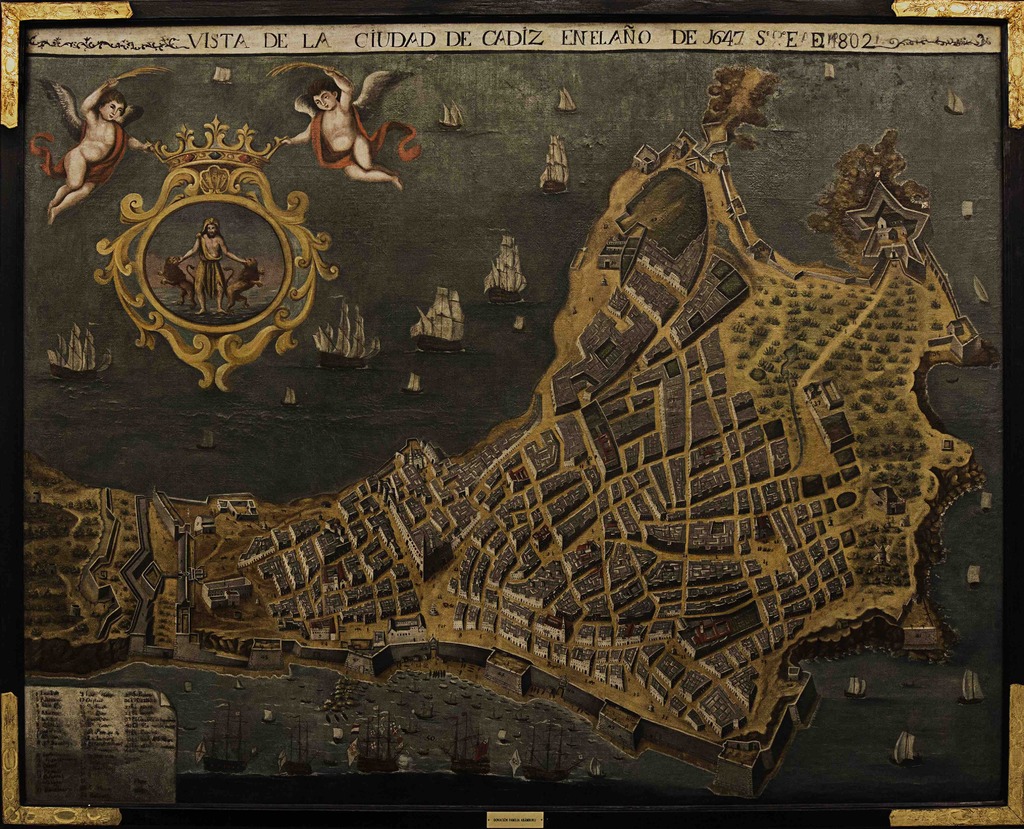 En la inscripción situada en la parte superior del lienzo aparece “Vista de la ciudad de Cádiz en el año de 1647” y a esto le sigue una fecha más el año “1802”, lo que en un principio hizo creer que se trataba de una obra decimonónica que pretendía representar el Cádiz de dicho año.