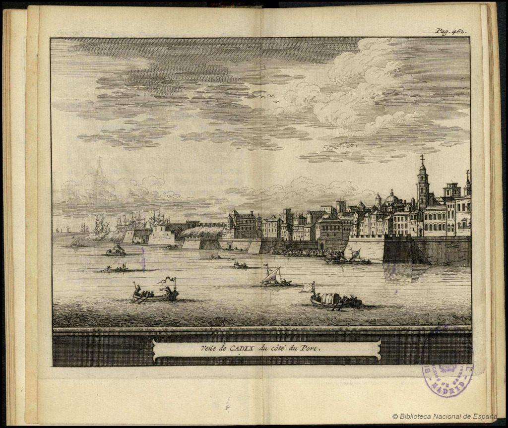 Puerto de Cádiz. Se encuentra dentro de la obra: "Les delices de l'Espagne & du Portugal " de Juan Álvarez de Colmenar. Concretamente en el Volumen 3 página 462.