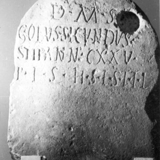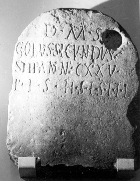 D(is) M(anibus) s(acrum) / G(aius) Olus Secundus / (O)stip(ponensis) ann(orum) CXXV(!) / p(ius) i(n) s(uis) h(ic) s(itus) e(st) s(it) t(ibi) t(erra) l(evis)