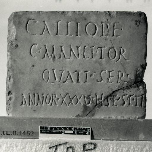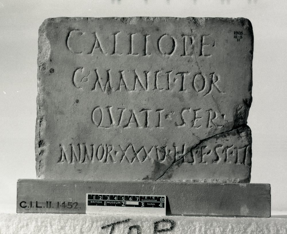 Calliope, esclava de Caio Manlio Torcuato / de 35 años de edad, aquí está enterrada / Que la tierra te sea leve