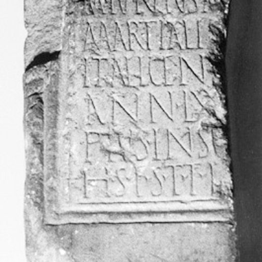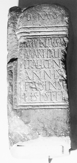 D(is) M(anibus) s(acrum) / M(arcus) Iunius M(arci) [f(ilius)] / Martialis / Italicens[is] / ann(orum) LXV[--?] / pius en su[es] / h(ic) s(itus) e(st) s(it) t(ibi) t(erra) l(evis)