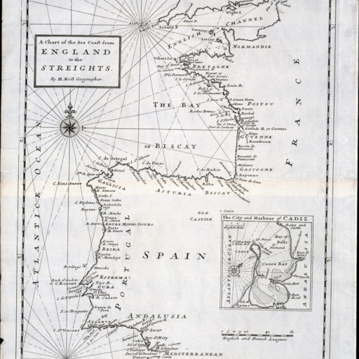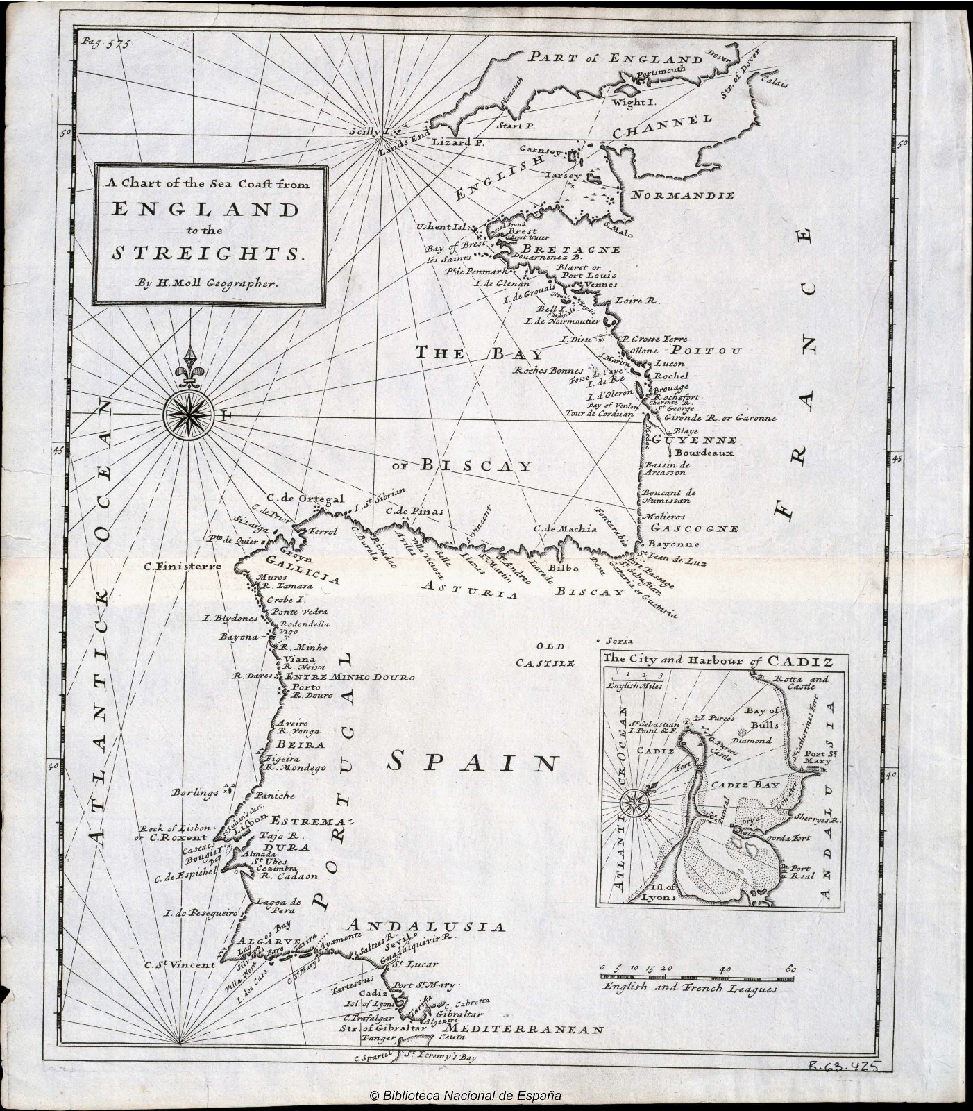 Mapa de la costa del mar desde Inglaterra hasta el Estrecho.