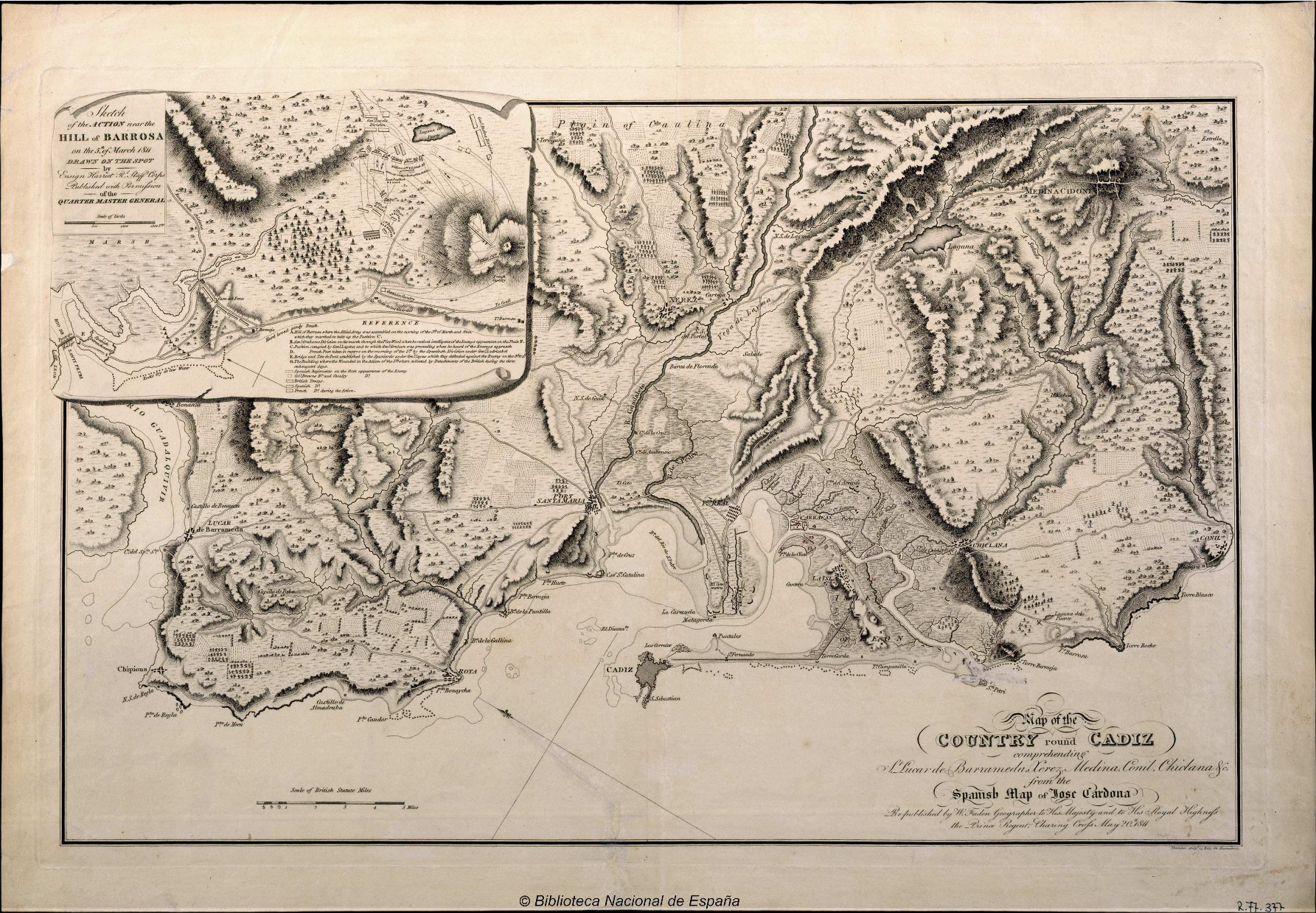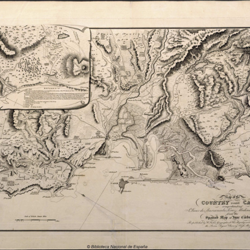 Map of the Country round Cadiz [Material cartográfico]: comprehending St. Lucar de Barrameda, Xerez, Medina, Conil, Chiclana. from the Spanish Map of Jose Cardona.