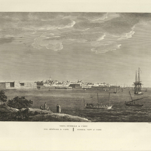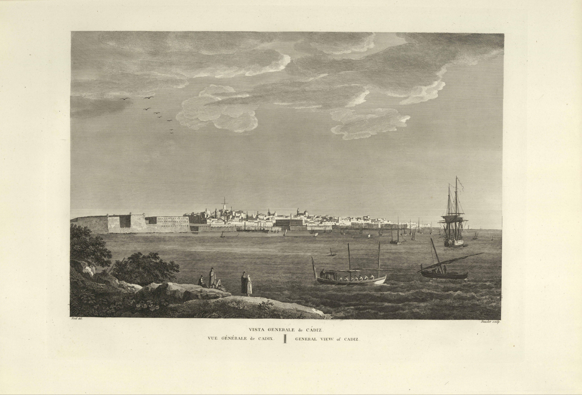 Vista General de Cádiz, se encuentra en la obra: "Voyage pittoresque et historique de l'Espagne" en el Tomo 2 página 20. Realizada por Alexandre de Laborde