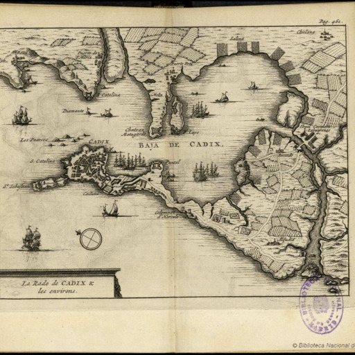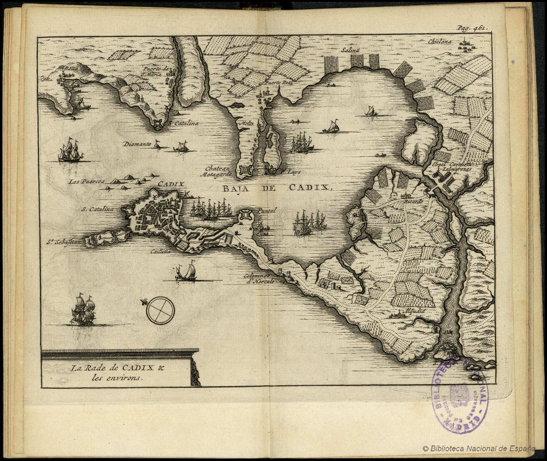 Plano dela Bahía de Cádiz encontrado en la obra "Les delices de l'Espagne & du Portugal " de Juan Álvarez de Colmenar. Volumen 3 página 461.