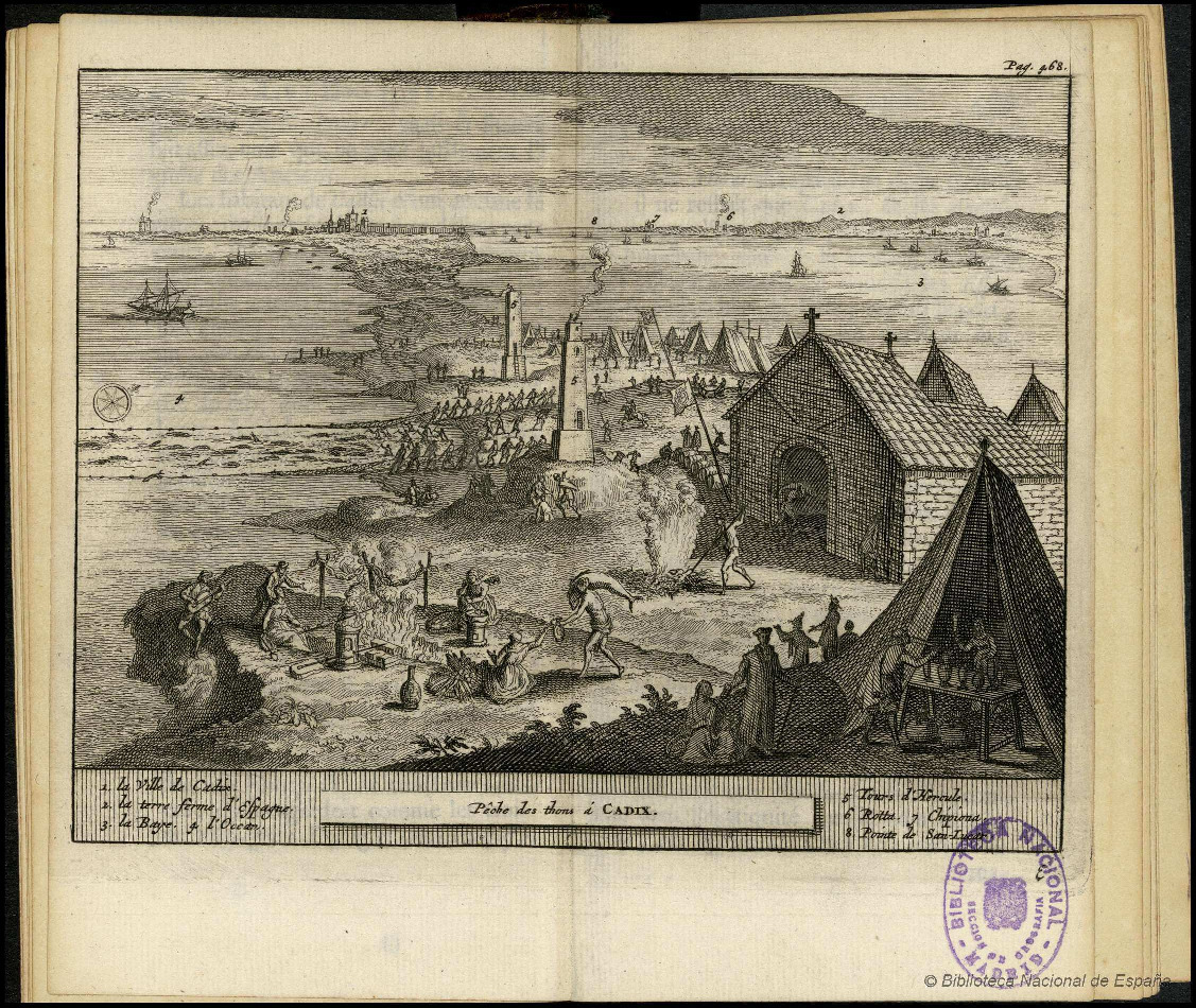 Pesca del Atún. En la obra: "Les delices de l'Espagne & du Portugal " de Juan Álvarez de Colmenar. Concretamente en el Volumen 3 página 468.