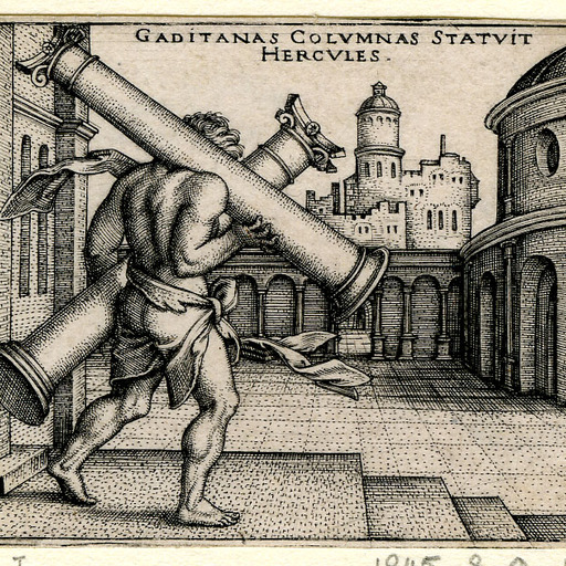Hércules cargando las columnas de Gades; caminando hacia la derecha en primer plano a la izquierda hacia unos escalones de piedra; un paisaje urbano con un templo redondo a la derecha en el fondo; de una serie de doce grabados.