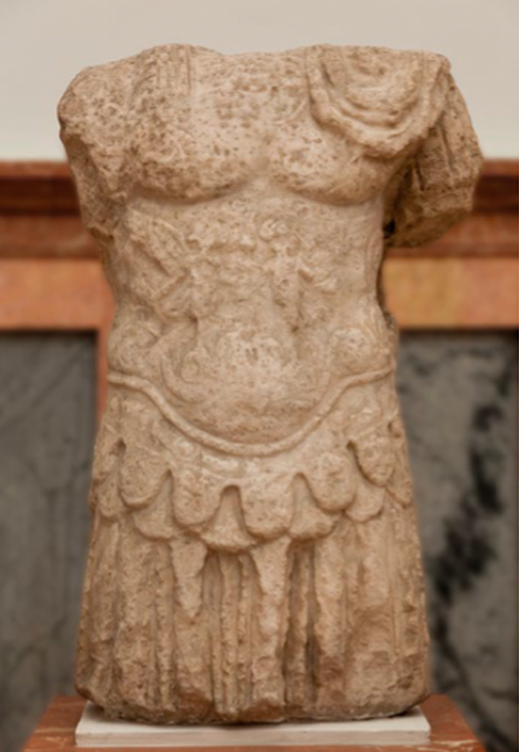 Fragmento de torso masculino con un traje militar cuya decoración incluye la cabeza de gorgona medusa y dos victorias