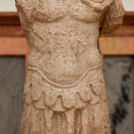 Esta pieza es un torso de estatua "thoracata", realizada para representar a un emperador o a un militar de alto rango de época de Claudio (41-54 d.C.). Su decoración es relativamente habitual y tiene ciertas similitudes con otra figura del mismo tipo procedente de Itálica (CE00104). La Gorgona es un símbolo de protección que puede verse en numerosos ejemplares de thoracatos de Hispania y el mundo romano, y las victorias alzando un trofeo son una iconografía frecuente en el mundo bélico desde época helenística, alusivas a determinados episodios militares o de conquista. Considerada desde antiguo como procedente de Itálica, posiblemente se trate de una de las estatuas instaladas por Juan de Córdoba Centurión en su jardín arqueológico en Lora de Estepa (segunda estatua del manuscrito de Alejandro del Barco), trasladada posteriormente por Francisco de Bruna al Alcázar de Sevilla para formar parte de la Colección de Antiguedades de la Bética, de donde pasó al Museo por disposición de la Comisión Provincial de Monumentos en 1880. Es posible que en este dilatado recorrido dentro del coleccionismo sevillano perdiera su referencia histórica y se atribuyera su procedencia a la ciudad romana de Itálica junto a otras piezas de la colección fundacional del Museo (López Rodríguez, 2017)