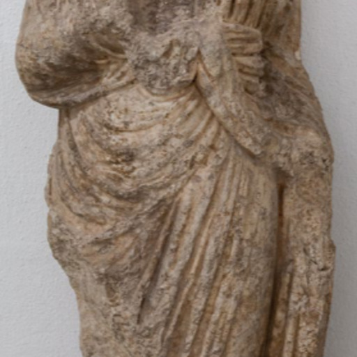 Se trata de una estatua femenina vestida con stola y palla cuyos pliegues se recogen hacia el centro de la figura