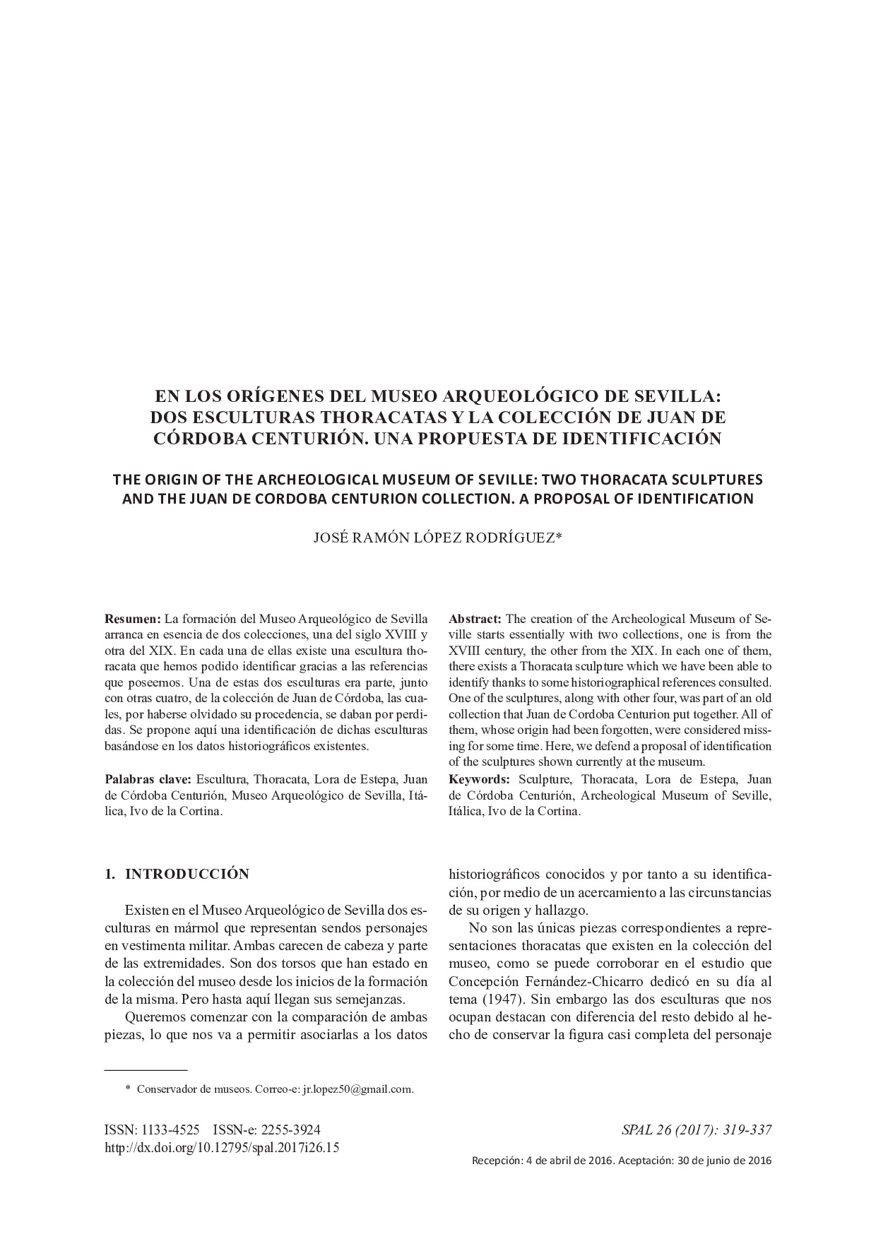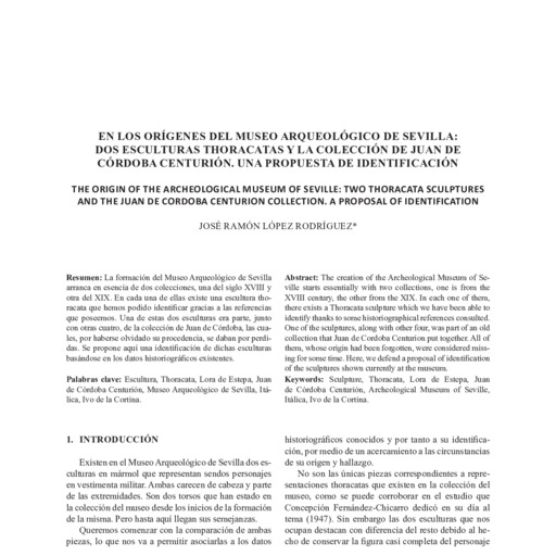 Resumen: La formación del Museo Arqueológico de Sevilla arranca en esencia de dos colecciones, una del siglo XVIII y otra del XIX. En cada una de ellas existe una escultura tho-racata que hemos podido identificar gracias a las referencias que