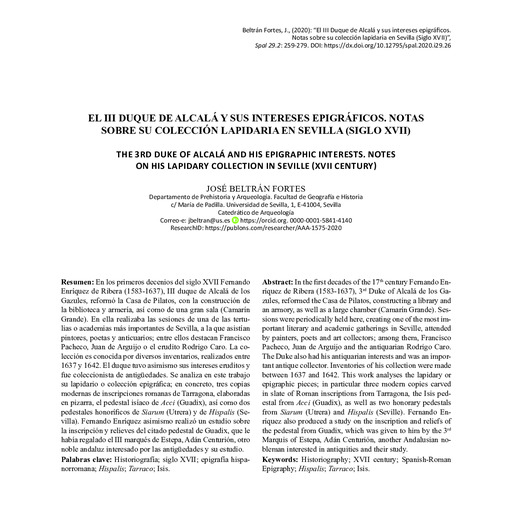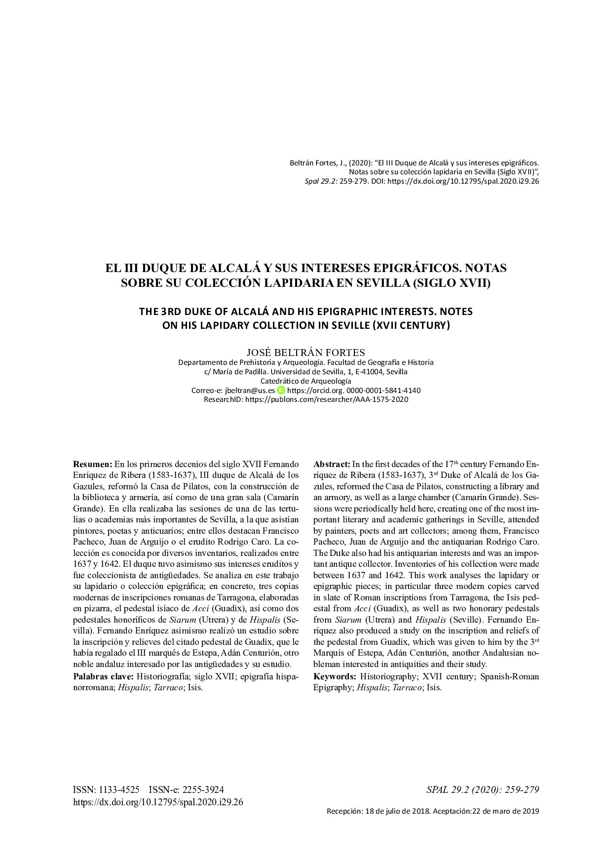 In the first decades of the 17th century Fernando Enríquez de Ribera (1583-1637), 3rd Duke of Alcalá de los Gazules, reformed the Casa de Pilatos, constructing a library and an armory, as well as a large chamber (Camarín Grande). Sessions were periodically held here, creating one of the most important literary and academic gatherings in Seville, attended by painters, poets and art collectors; among them, Francisco Pacheco, Juan de Arguijo and the antiquarian Rodrigo Caro. The Duke also had his antiquarian interests and was an important antique collector. Inventories of his collection were made between 1637 and 1642. This work analyses the lapidary or epigraphic pieces; in particular three modern copies carved in slate of Roman inscriptions from Tarragona, the Isis pedestal from Acci (Guadix), as well as two honorary pedestals from Siarum (Utrera) and Hispalis (Seville). Fernando Enríquez also produced a study on the inscription and reliefs of the pedestal from Guadix, which was given to him by the 3rd Marquis of Estepa, Adán Centurión, another Andalusian nobleman interested in antiquities and their study.