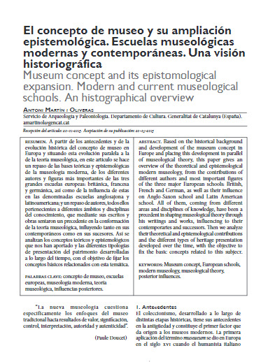 A partir de los antecedentes y de la evolución histórica del concepto de museo en Europa y situando esta evolución paralela a la de la teoría museológica, en este artículo se hace un repaso de las bases teóricas y epistemológicas de la museología moderna, de los diferentes autores y figuras más importantes de las tres grandes escuelas europeas: británica, francesa y germánica, así como de la influencia de estas en las denominadas escuelas anglosajona y latinoamericana; y un repaso de autores, todos ellos pertenecientes a diferentes ámbitos y disciplinas del conocimiento, que mediante sus escritos y obras sentaron un precedente en la conformación de la teoría museológica, influyendo tanto en sus contemporáneos como en sus sucesores. Así se analizan los conceptos teóricos y epistemológicos que nos han aportado y las diferentes tipologías de presentación del patrimonio desarrolladas a lo largo del tiempo, con el objetivo de fijar los conceptos básicos relacionados con esta temática