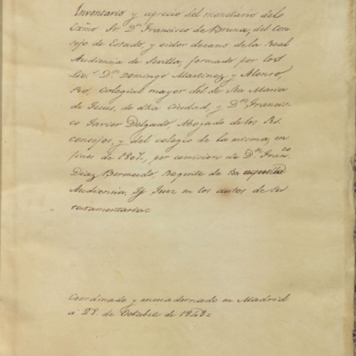 Inventario y aprecio del monetario del Excmo. Sr. Francisco de Bruna y Ahumada, hecho a su muerte en 1807 por D. Domingo Martínez y Alonso Pío, y D. Francisco Javier Delgado. Inventario y aprecio de las antigüedades y piedras labradas de D. Francisco de Bruna y Ahumada por D. Joaquín Cabral y Bejarano